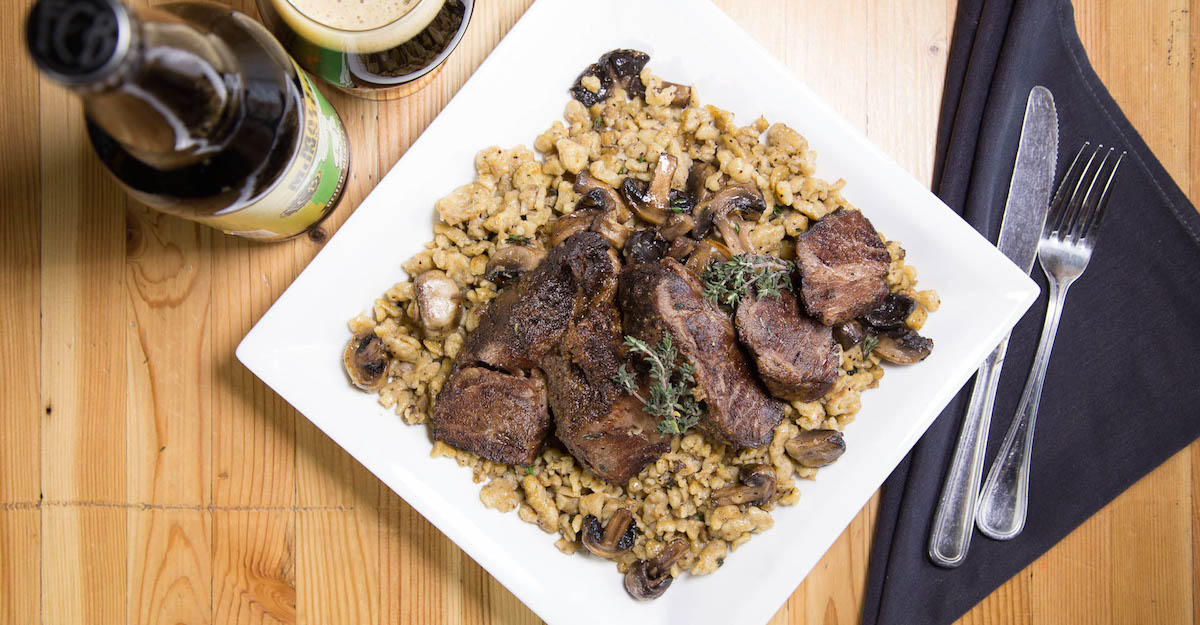 The inspiration for this dish started with the season and then the beer selection. "In the midst of winter, we start to take it a bit slower and have time for preparing warm hearty dishes. Since Deiter, Dunkel Lager was the newest addition to our Malt Monster series, we chose to highlight that particular brew. Beer-braised short ribs are a winter favorite, but we wanted to incorporate a German influence [to reflect Deiter, Dunkel Lager’s roots]. Thyme and mushroom spätzel seemed like the perfect pairing—with the earthy mushrooms playing against the sweetness of the beer, while the roasted chocolate flavors balance out the short ribs, ” says Peters.