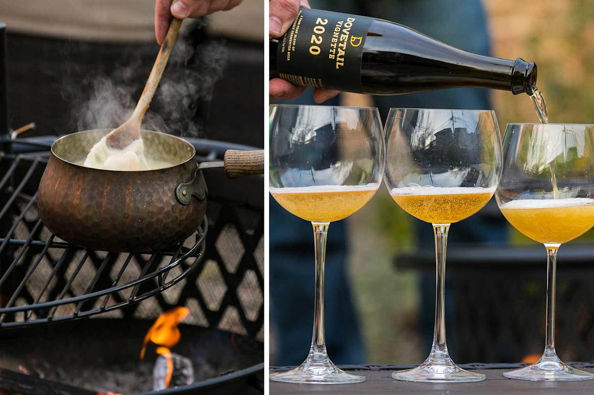 A year or so ago, we two industry friends—Jenny at Dovetail Brewery, John at Revolution Brewing—combined our loves of beer, cheese, winter, and hucksterism to host a one-day fondue-and-sausage popup at Dovetail. But BrewSKI wasn’t just any Midwestern Fondue Brigadoon—we tapped the knowledge of Dovetail’s cellar team to build a fondue entirely around the character of their lambic-style beers. We called it spondue because if there’s one thing we love more than cheese, it’s a good portmanteau.